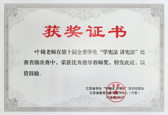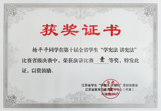 10月18日至19日,第十届全省学生“学宪法 讲宪法”演讲比赛省级决赛在江苏警官学院浦口校区举行。代表江苏警官学院参赛的2023级治安学专业(公安法制方向)1区队杨平平同学勇夺一等奖,叶镝老师荣获优秀指导教师奖。
