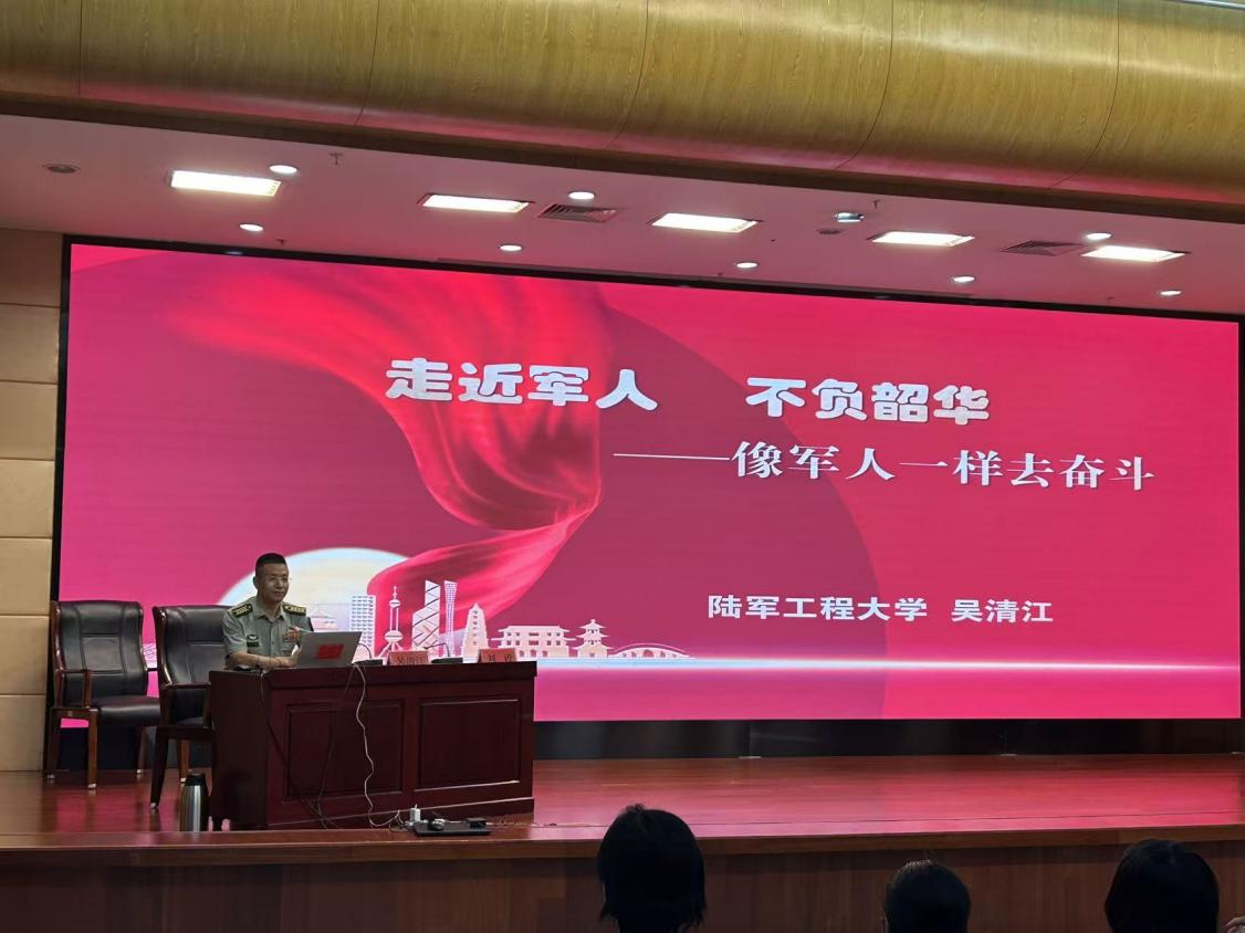 2025年8月28日,我院邀请陆军工程大学政治工作系副主任吴清江教授,在学院学术报告厅(二)为我院2025级新生开设题为《励志青春,不负韶华 —— 像军人一样去奋斗》的国防教育讲座。200名新生现场聆听了讲座,1653名同学通过录播系统实时观看。