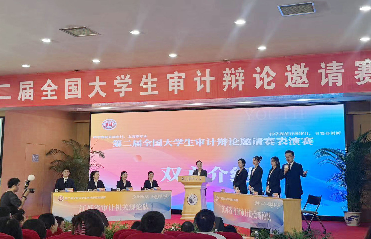 决赛期间特意增设了表演赛环节。学院审计处张骞作为内审协会辩论队四辩与其他单位内审人员,一起迎战由全省菁英组成的审计机关辩论队。围绕“科学规范开展审计:主要靠守正还是创新”主题,双方展开了一场激烈的思维“攻防”,充分展示了江苏青年审计人的风采与才识。