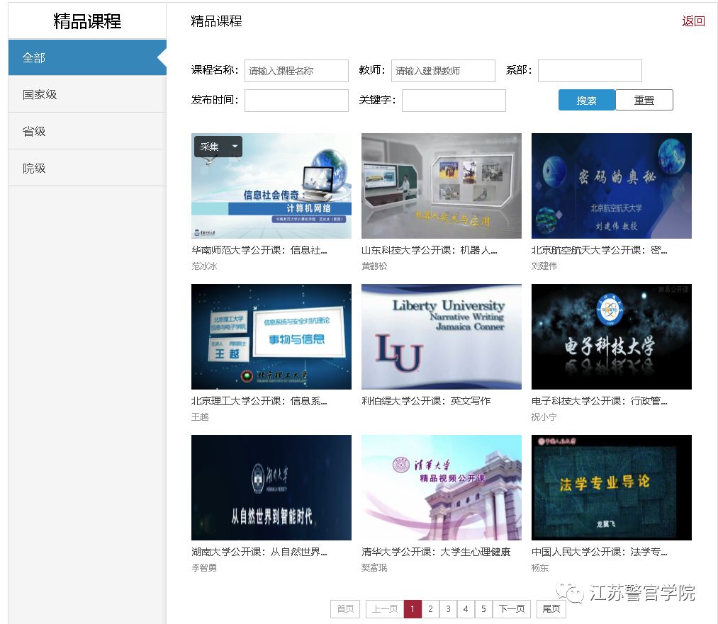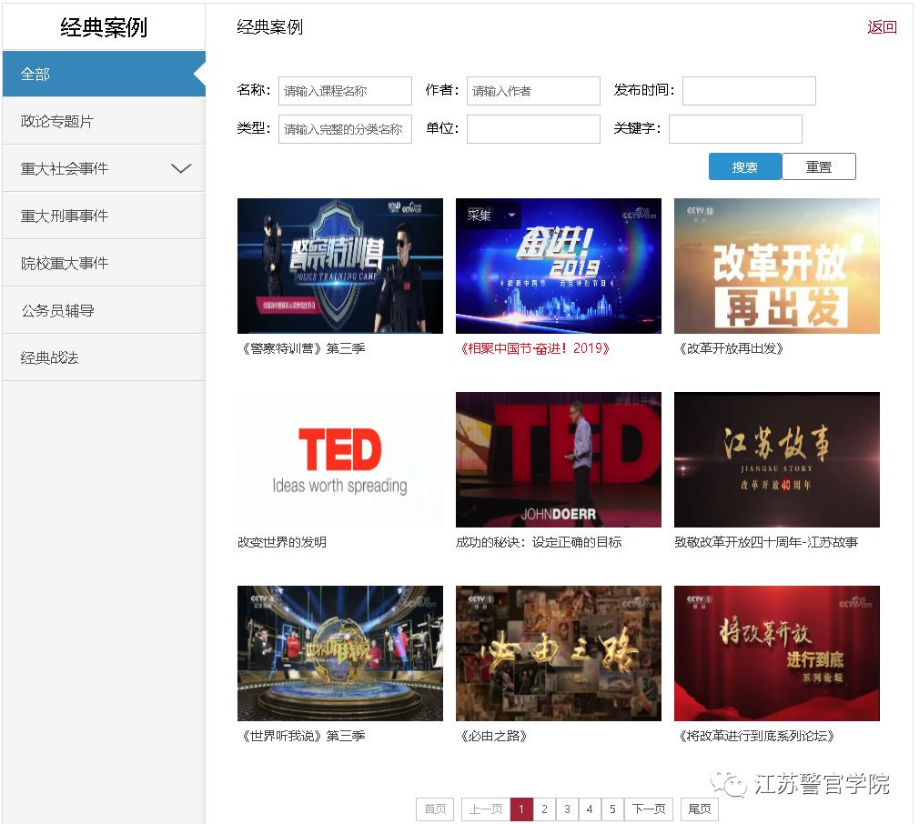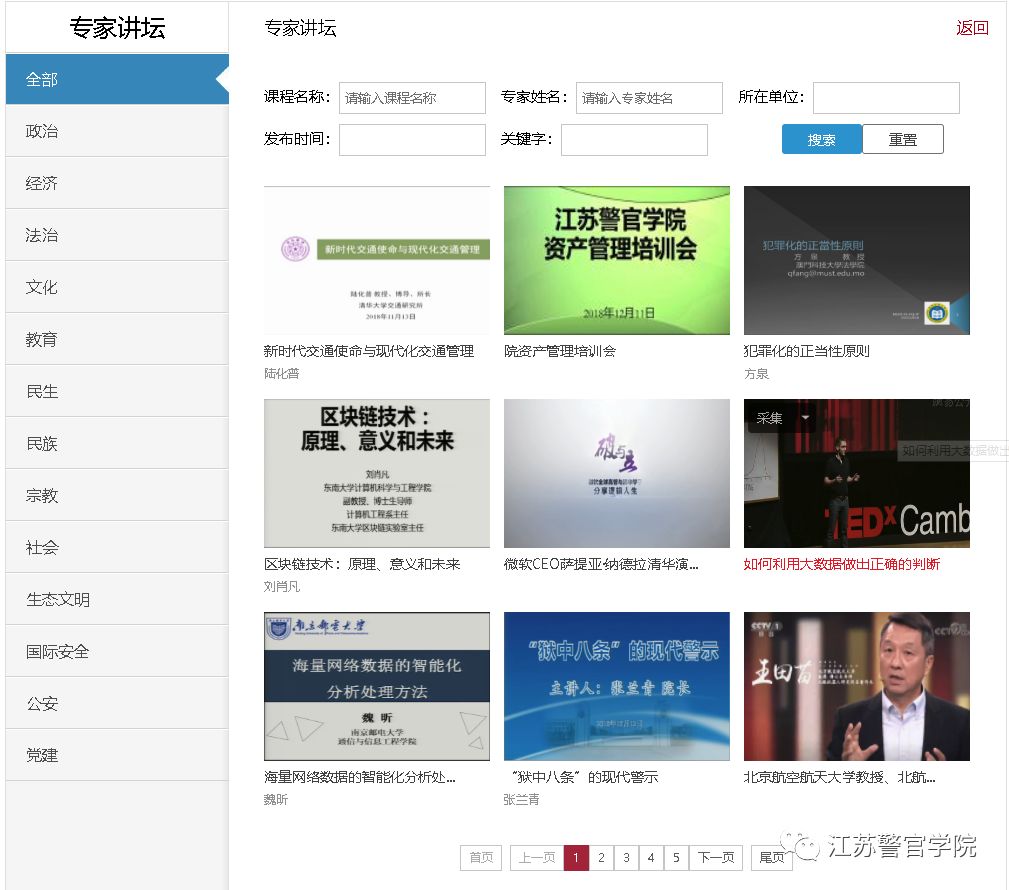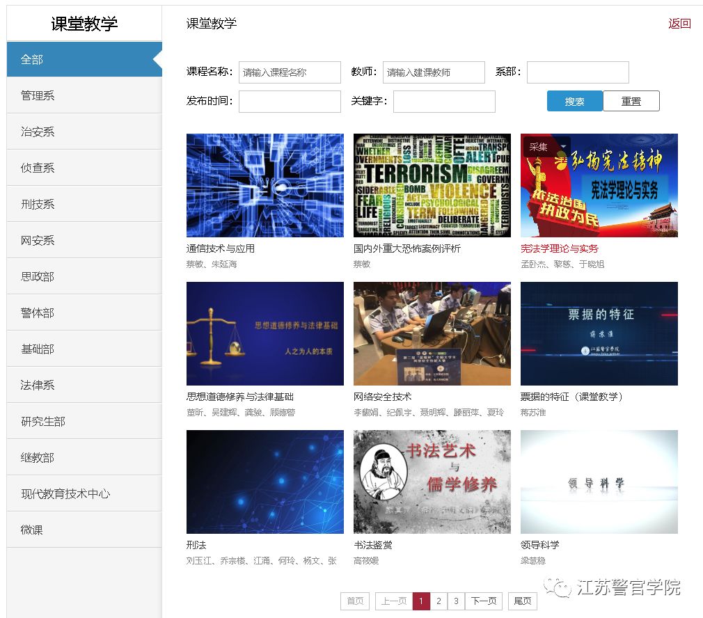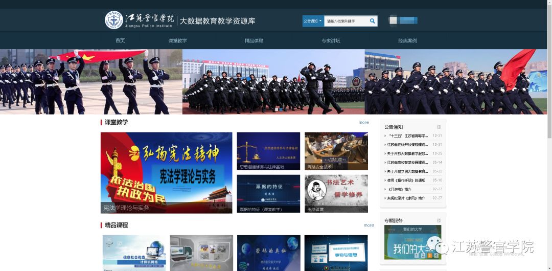 大数据教育教学资源库包含门户网站、“五大资源库系统”(课堂教学资源库、精品课程资源库、专家讲坛资源库、经典案例资源库和涉外警务资源库)和“三大应用系统”(教学资源课堂教学可视化分析应用、智慧教室课堂教学视频资源整合应用、以及APP移动系统应用),汇聚200余门课堂教学资源和717余部4000多章节视频教育教学资源,面向全院师生开放使用,大家可随时随地享受免费优质资源。